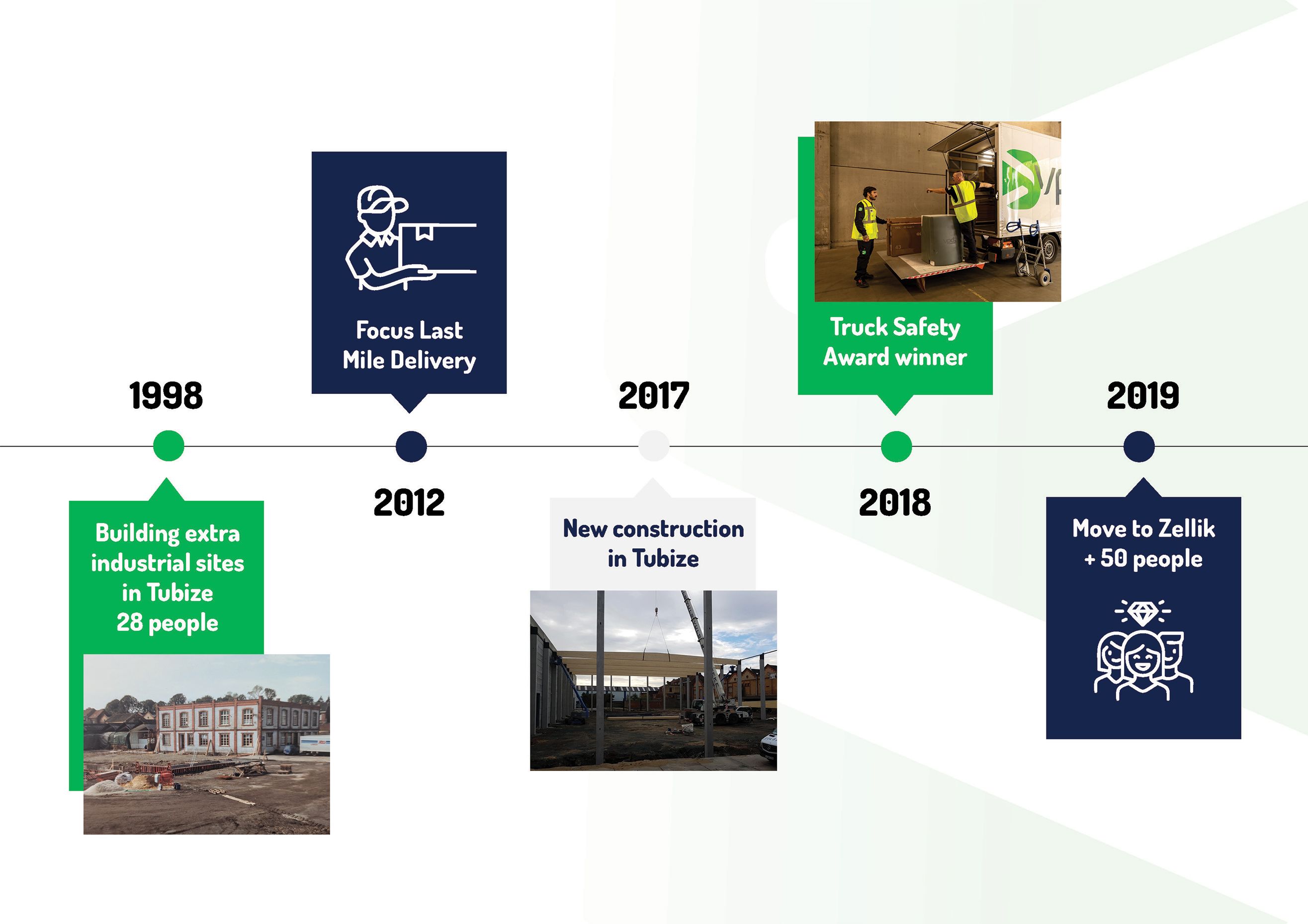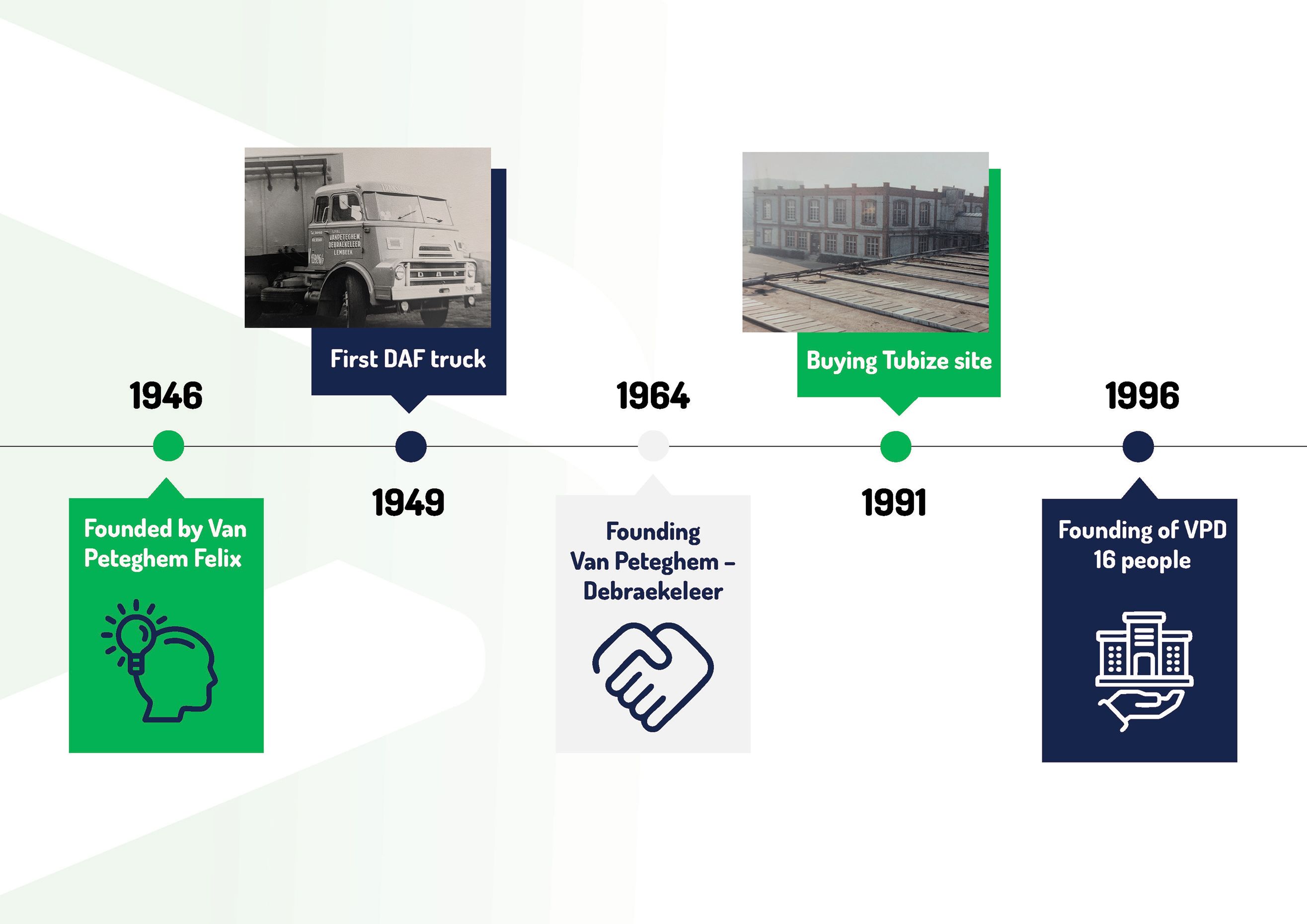 VPD a été fondée en 1946. A cette époque, notre activité principale était le transport de matériaux de construction et de charbon. Au fil des ans, VPD est passée d'une petite entreprise familiale à une PME avec 8 succursales situées à des carrefours stratégiques importants.